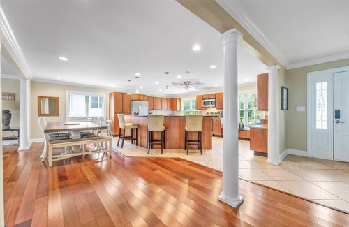 The expansive kitchen is equipped with stainless steel appliances and abundant storage. A dining table along with extra seating at the countertop ensures a comfortable dining experience.