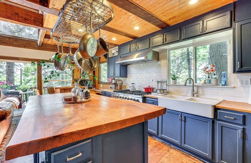 Tucked away in Arrowhead Villas, this cozy 4-bedroom, 3-bathroom vacation rental offers a peaceful mountain setting with treehouse charm. Blending rustic character with modern upgrades, the retreat features inviting outdoor spaces, a wood-burning stove, and a dedicated office area. When you're not relaxing in your cabin, enjoy nearby Lake Arrowhead Village and the scenic beauty of San Bernardino County!