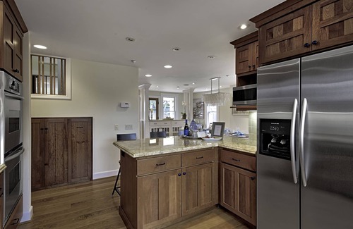The updated kitchen includes stainless steel appliances, including a gas range and a double oven, in addition to custom-made cabinetry and granite counter-tops. Down the hall is a convenient half-bath as well as a combination office and laundry room. Well-equipped for extended stays!
