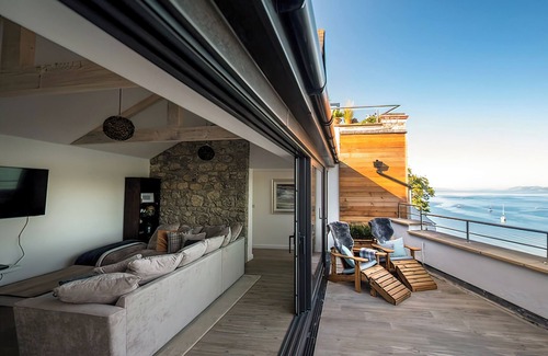 Bedroom 4: Super Kingsize (6ft) Bed Ensuite: Walk-In Shower, Toilet. Gas central heating, gas, electricity, bed linen, towels and Superfast Wi-Fi included. Travel cot, highchair and stairgate.. Balcony with outdoor furniture. Bike/kayak/paddleboard store. Private parking for 2 cars; additional on road parking. No smoking.. Fully refurbished to an exceptional standard, once inside this stylish home you’ll be greeted by an open-plan kitchen and living area with ample space for everyone, fully equipped with everything you’ll need for your stay. The spacious living room with it’s truss beam vaulted ceiling and stunning sea and mountain views provides a wonderful relaxing area. Each bedroom has an en-suite, and each benefits from either full or side views over the Menai Strait. Outside is a spacious balcony area, the perfect spot to sit, relax and watch the yachts sail by. The property also boasts a games room with pool table and darts board to enjoy and further basement storage for sports equipment if needed. There’s absolutely no doubt you’ll not be disappointed with your stay here.