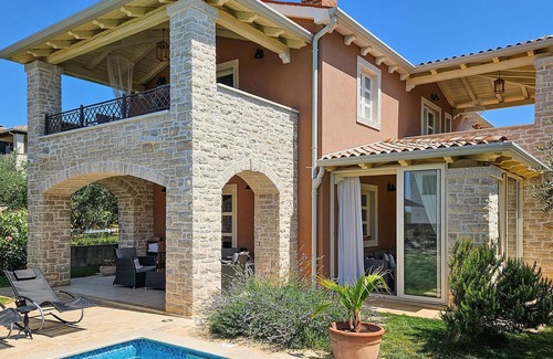 The imposing Villa Ginocchetti, which was built in 2018, is hidden in the Istrian town of Valentići, part of the municipality of Kaštelir. The villa is surrounded by beautiful olive greenery, which will make your holiday especially relaxing. You can also relax on the rocky beach which is only 7 kilometres away from the villa.