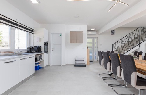 The modern and very well equipped house will fulfill all your wishes. Pack your friends or family and experience unforgettable vacations here. The space available is extensive. Relax either in the large living and dining area, on the second floor terrace or in your bedroom with private TV.