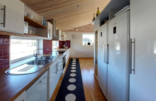 Surrounded by picturesque hiking trails and close to beautiful beaches, this bright and spacious house offers you a comfortable base for eventful days with your loved ones. Light up the wood-burning stove and use the cosy, spacious living room for sociable games evenings, stimulating conversations and happy meals at the inviting dining table.