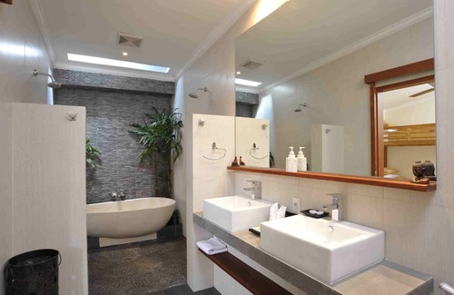 This villa has 4 bedrooms and 4 bathrooms. The bathrooms come complete with double vanities, double shower heads, toilet and a stone bath tub. All 4 rooms are air-conditioned with ceiling fans, kingsize bed, wardrobe, with one of the rooms having an extra set of bunk beds. All rooms have a safe to lock your valuables away.