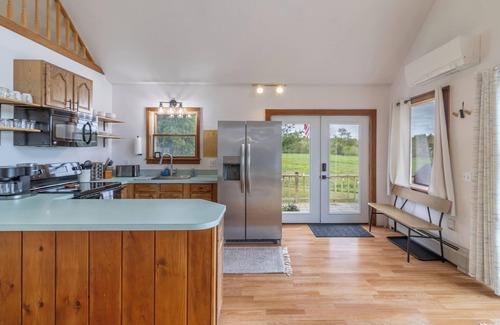 The living room has a top of the line electric pellet stove for added warmth in the winter months and cold nights. There is also a brand new mini split with air conditioning and heating. The living room has a 55” Smart Roku TV that allows for unlimited streaming capability. You have the ability to log into your streaming services in "guest mode" that will automatically log you out of on the date of your departure. There is no cable TV.