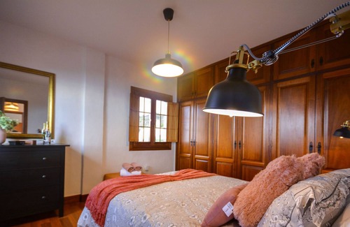 From Finca Los Castaños you can enjoy a fantastic panoramic view of the sea and, in good weather, of Mount Teide. The finca is in a quiet location in the upper part of San Juan de la Rambla, 590 meters above sea level. The stylishly and comfortably furnished house, including the extension, is available for your sole use. Even if you are traveling with fewer than five people, all rooms in the house are open to you, so you can decide for yourself which rooms you want to use. The finca also has a covered private pool with relaxation area and solar shower, as well as a spacious, enclosed courtyard (6,000 square meters) with fruit trees. Surroundings: Shopping 1.5 km, supermarket 1 km, restaurant 500 m, sea 5 km, bathing bay 5 km, Tenerife North Airport 37 km, La Guancha 5 km, Icod de los Vinos 9 km, Santa Cruz de Tenerife 48 km. Activities: Private outdoor pool, 21 sqm, partly covered, heatable (for a fee), outdoor shower. Various hiking trails with different levels of difficulty start in the immediate vicinity of your accommodation. We also recommend a hike around the Teide, for example on the Siete Cañadas circular route. Information about the routes is available at the El Portillo Visitor Center. Another tip is to take the cable car up Mount Teide. For children: 2 cots (in addition to the maximum occupancy), please reserve. The following applies to all accommodation: over 2 floors, stylishly furnished. Satellite TV, radio, WLAN. Open kitchen, ceramic hob, oven, fridge with freezer compartment, dishwasher, microwave, coffee machine, toaster, eating nook. fireplace, electric radiators. Washing machine. Terrace, conservatory, garden furniture, barbecue, loungers. PKW parking lot. Hints: Not suitable for people with limited mobility. We recommend booking a rental car