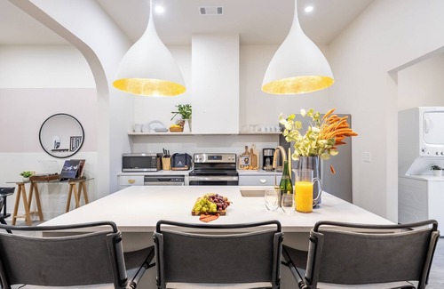This four-bedroom apartment has a spacious layout perfect for a group looking to connect and explore the city. You’ll find chic, Nashville-inspired design and a vibrant, playful atmosphere. A warm and vibey living room and a dining area are ideal for spending quality time with your group, while the fully equipped kitchen boasts a full suite of appliances and everything you need to make at-home meals and snacks a breeze.
