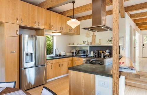 This fully equipped kitchen includes modern appliances such as a dishwasher, garbage disposal, range/oven, refrigerator, microwave, and coffee machine. It also comes stocked with cookware, dinnerware, and wine glasses. A dining counter with three bar stools offers a great spot for casual meals or morning coffee.