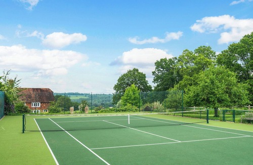 Bathroom: Bath, Cubicle Shower, Toilet. Gas central heating, gas, electricity, bed linen, towels, Wi-Fi and fuel for open fire included. Welcome pack. Grounds with sitting out area, garden furniture and gas barbecue. Outdoor swimming pool (private). Tennis court. Private parking for 5 cars. No smoking. Please note: There are 2 steps in the grounds.. Nestled in the idyllic countryside where Sussex meets Kent, this charming country house offers both tranquillity and elegance. Perched in a slightly elevated position, the period farmhouse boasts stunning views of the rolling landscape, providing a serene backdrop for a peaceful retreat or a vibrant family home.