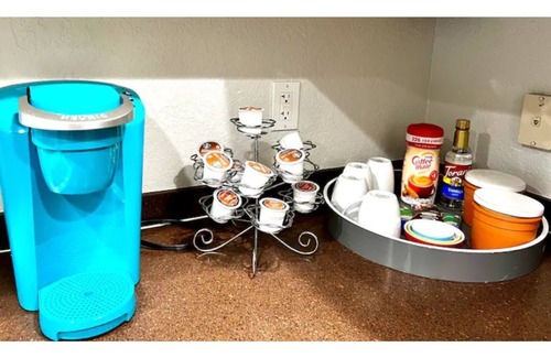 The full sized kitchen features a 4 burner gas stove, fridge, microwave oven, and dishwasher. The kitchen is stocked with cookware, dishes, mugs, utensils, Keurig coffee maker, Starbucks coffee station and essential cleaning supplies. Starter coffee supplies is provided.