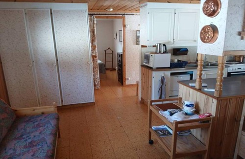 Layout: Living room(single folding bed), Kitchen(cooker(electric), coffee machine, oven, dishwasher, fridge-freezer), Living/bed room(double folding bed), bedroom(double bed), bathroom(washbasin, shower, toilet, washing machine, drying cabinet), balcony, heating(electric), garden furniture