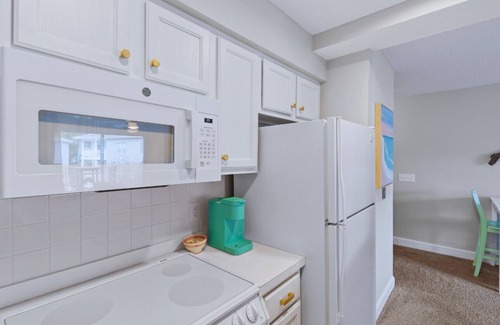 Rest and relaxation await you in this cozy one bedroom/one bath villa located on third level and only 3.5 miles to Sunset Beach. The open floor plan features adjoining kitchen, dining and living areas. The living room has a sofa and two swivel club chairs, a large wall-mounted Roku Smart TV, overhead ceiling fan and balcony. Enjoy preparing a nice meal and relaxing after a day at the pool, a local golf course or on the beach. The kitchen is fully equipped with dishwasher, full-sized refrigerator, stove, microwave, Keurig coffee maker and toaster. There is a dining table for two with additional seating at the bar for three. The living room opens to a balcony offering the perfect spot to take in the fresh sea air with morning coffee or an evening beverage. The front bedroom has 2 queen beds and is privately located off the main area of the condo with a full bath. The bedroom has an overhead ceiling fan, comfy mattresses and Roku TV to enjoy settling in for the evening. The bath includes a soaking jetted tub and walk-in shower, and fresh towels are provided. The condo is located within walking distance to the community indoor/outdoor pools and there is an exercise room available for guest use. The property grounds have free-standing charcoal grills and picnic tables in the interior courtyard.