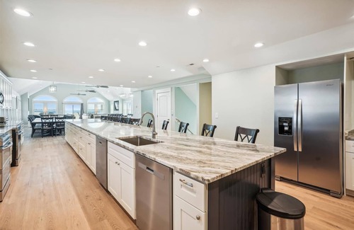 Upstairs, you'll be greeted by an open and super spacious living area. Complete with not one, but two living areas, everyone is sure to have a place to hang out and relax while taking in stunning ocean views. Preparing meals for big groups is no problem at Wench's Pad 4. The kitchen features 2 stoves, 2 microwaves, 2 refrigerators 3 dishwashers, and a massive kitchen island, all for your convenience. There's plenty of room to dine at the kitchen island or at 1 of the 2 dining room tables. This level also gives you access to the oceanfront covered deck that features polywood tables and chairs. Perfect for dining while taking in the salt air or simply relaxing and enjoying your morning coffee while the sun rises. From this outdoor space, you'll also be able to access the spacious, furnished sun deck that offers you the most amazing unobstructed ocean views. Wench's Pad 4 features 20 bedrooms, allowing you and your crew plenty of space to stretch out, relax, and get a restful night's sleep during your stay. Wench's Pad 4 is truly a one-of-a-kind, spacious Outer Banks rental that's ready for you, your family, and your friends to enjoy.