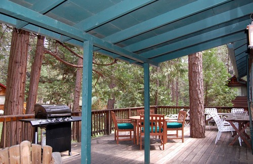 Hansen Cabin is a charming and cozy 2 bedroom, 2 bathroom, a home that sleeps up to 6 guests. The fully equipped kitchen has all essentials for cooking and dining, including a dishwasher, microwave, and a JennAir range. The living room has a fireplace (wood provided in season), satellite TV, and WiFi. The private and secluded deck has a gas BBQ for grilling and a table with chairs for dining under the stars, as well as a picnic table and lounge chairs for relaxing and enjoying the Yosemite forest view. No pets allowed. Does not have air conditioning. "EV Charging Station available within five miles of the cabin"