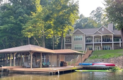 A Special Family Lake House! This beautiful private paradise has deep water (9FT) and is located just off the main lake! It has 6 bedrooms, 2 bunk rooms and 4 bathrooms. The spacious 2 -ensuites master bedrooms has a covered porch for peaceful morning coffee. The main level also has 2 additional bedrooms and bathrooms, as does the lower level. A large great room with gorgeous floor to ceiling stone fireplace. Dining for 14 people in large gourmet kitchen and great room dining . Outside the main level is a stunning patio with stone fireplace and cozy seating for your morning coffee or evening cocktail. . An entertaining room with full kitchen, large screen tv, pool table, shuffleboard table and walk out sliders to the beautiful waterfront. The dock has plenty of space to bask in the sun or catch some shade in the bistro! Water toys Kayaks and paddleboat are close by at the waters edge for easy use. This home will not dissappoint! Come stay with us!