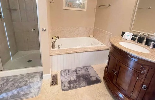 6 master bedrooms all have queen beds and standard tub style full bathrooms. 1 master bedroom on the first floor has a stand-up shower and a jacuzzi tub, 2 sinks. Additional full size and a half size refrigerator on the large screened in porch. Air mattress in the down stair closet if needed.
