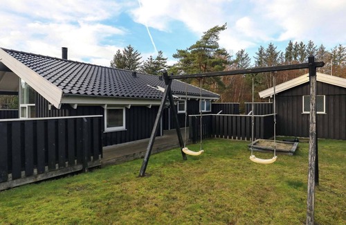 Layout: open kitchen(cooker(electric), hood, coffee machine, microwave, dishwasher, fridge-freezer), Living/bed room(TV(german television channels, danish TV channels (DR1 and TV2)), CD player, stereo unit, high chair), bedroom(double bed, children's bed), bedroom(double bed), bedroom(2x single bed), bathroom(floor heating)(tumble dryer, bathtub or shower, washbasin, toilet, washing machine), carport, sauna(4 persons), heating(electric), terrace, terrace(roofed), BBQ, play equipment, air to air heatpump