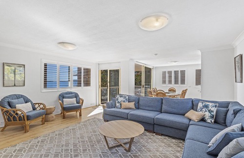 Three bedrooms, two bathrooms, Foxtel, secure car park, water views and right across the road from the beach.