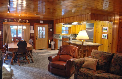 Half Dome is a beautiful, Gold rated, 2 Bedroom, 2 Bathroom home situated in a secluded setting that sleeps up to 6 guests. The fully equipped kitchen has granite countertops, a dishwasher, a gourmet Wolf range, and a sub-zero refrigerator/freezer. The living room has a grand rock fireplace (firewood provided in season), central heating and air, a flat-screen satellite TV, and WiFi. The second bedroom also has a satellite TV and an IPod docking station. The large, private deck has seating and a built-in gas BBQ for outdoor relaxing, grilling, and dining. No pets are allowed. "EV Charging Station available within five miles of the cabin"