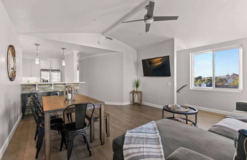 Enjoy water views from the comfort of your own vacation home and relish in the convenience of being mere moments away from sinking your toes into the sandy shores of Mission Beach. Step inside to discover a spacious and inviting living area, complete with hardwood floors, a flat-screen TV, ceiling fan, plush couch, and comfy chairs - the perfect spot to unwind after a day of sun-soaked adventures. Channel your inner chef in the sleek and stylish kitchen, equipped with stainless steel appliances, a breakfast bar with seating for three, and a dining table with room for six. Slide open the doors to the outdoor balcony, letting in in the refreshing sea breeze from the sunny living space. The open layout seamlessly transitions into the dining space, creating the perfect setting for relaxation and socializing. All four bedrooms boast ceiling fans and ample natural light for a serene and restful ambiance. The primary bedroom offers additional comforts including a flat-screen TV and an en-suite bathroom for added privacy and convenience. Say goodbye to sandy clothes with the in-unit washer and dryer, and make memories with loved ones on the shared outdoor patio, complete with a BBQ grill and dining table - perfect for reveling in barbecues at golden hour.