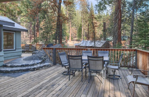 The Little Creek Cabin is a charming, 2 bedroom, 2 bathroom home that sleeps up to 9 guests. The fully equipped kitchen includes a dishwasher. The home also has a washer and dryer. The cabin also has Central heat and A/C. The family room has a fireplace (wood provided in season), satellite TV, Wifi, and plenty of seating, as well as a queen sofa sleeper. The bonus room has a second fireplace, a queen sofa sleeper, and a twin bed. The large, private deck has a gas BBQ and a covered area, perfect for grilling/dining under the stars. There is a bridge looking over a small creek that runs through the property. The back of the property backs up to an undeveloped Yosemite National forest, perfect for wildlife viewing and solitude. This home is * pet-friendly, maximum of 2 pets. "EV Charging Station available within five miles of the cabin"