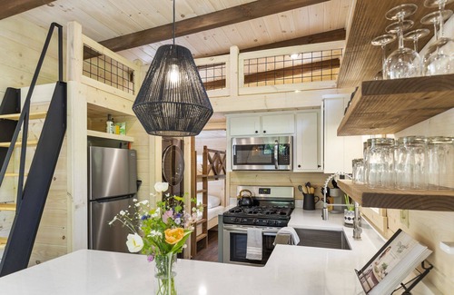 Island seating, gas stove, dishwasher, Keurig + pour-over, cookware, toaster, crockpot, blender, fridge, and full washer/dryer.