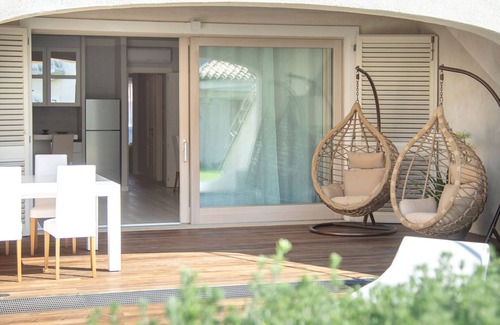 Completely new apartment, furnished by architect: ground floor facing the pool with large private veranda and dining area for 8 people, armchairs and sun loungers. Kitchen complete with microwave and dishwasher. Living room with corner sofa and dining area for 8 people. Two bedrooms and two bathrooms. Air conditioning and heating. Very close to the town center of Palau and very close to the beautiful La Sciuamara beach
