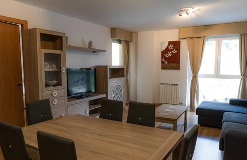 We present you the flat El Riu, it has capacity for 6 people, one bedroom with double bed, another bedroom with two single beds and a sofa bed. It has a kitchenette, bathroom and balcony with spectacular views over the valley of Arinsal. The El Riu flat has a lift that takes you to the Arinsal-Pal ski lift. Parking space in the building included in the price.