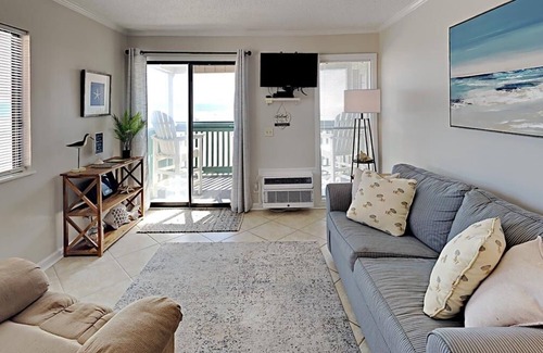 • Cozy living room with ample seating, a 42" TV, and a DVD/VCR player for relaxing movie nights while enjoying panoramic beach views