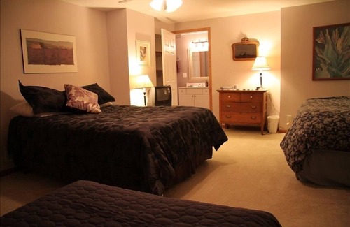 The main level also features two additional bedrooms, each with comfortable double beds, ceiling fans, and full closets. There is a separate full bath with a tub and shower for plenty of privacy for these two rooms.