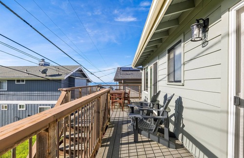 No Pets Allowed. This beautiful and inviting home is just "A Step Away" from Shamel Park, Moonstone Beach, the Fiscalini Ranch preserve and the West Village of Cambria. The large and comfortable living room has amazing ocean views and a gas fireplace - a great place to be, morning, noon or for sunset watching. There is a dining room off the fully furnished kitchen and a large deck, with a charcoal barbeque. Both the dining room and the deck have tables to seat six people. The house has WiFi, two flat screen TVs with DVD players. There are three King beds (a regular King and two California Kings). The backyard is protected from the wind and offers a beautiful spot for relaxation. The laundry room is on the ground floor. Ocean views, gas fireplace, charcoal BBQ, two TVs WiFi. TOT#6003870