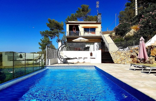 This beautiful villa on the hills is just a short drive from the beach resort of Sitges (10 km.), the Penedes wine region(20 min.)and at an easy 40 minutes drive from Barcelona. It is available all year round. The villa is built in a 1.200 sqm plot, it is Modern Designed, High-end furnished and fully equipped. It offers Splendid newly built Outdoor spaces overlooking the hills and the pool across 4 splendid terraces : 'Al-Fresco' Dining, Ibiza-style Chill-out lounge, scenic private 8x4 m. Infinity Pool stone-made fountain, portable BBQ. Brand new lounge set and swing-hammoc. Comfort and attention to detail are successfully achieved. Its calm and tranquil setting make it perfect for a relaxing retreat within pintoresque vinyards, near the best beaches and amenities and Barcelona's bive. An Oasis of Calm, Elegance and Privacy awaiting for you. Capacity : 6-9 persons (6 adults if in 3 couples, 4 adults+2-5 children if families, 8 adults if singles or singles+1-2 couples). Entrance : you enter the Villa by going down few stairs. You then face the main wooden door. Indoor : open plan concept : Italian design kitchen, dining room and lounge, balcony with dining table. 1 double or twin bedroom (2x90x190 cm. beds/ 1x180x190 cm. bed) with a double closet and a fan 1 bathroom with shower. Ground floor : 1 double or twin bedroom (2 single beds/1 bunkbed+1 single bed/ 1 KS double bed - sleeps 2 to 3) with aircon, 1 master suite with aircon(sleeps 2 to 5) with 1 king size bed (180x200 cm)+ 1 single bed and/or bunkbed, 1 optional en-suite single bed separated by a curtin, en-suite dressing room with closets, one large bathroom with bath tube and shower with mountain views. The suite has direct access to the West terrace and pool area, which is fenced for children safety. Outdoor : South-West terrace 80 sqm. and garden : 'Al-Fresco' diner, portable BBQ. Brand new porche lounge set and swing-hammoc. Folding hood and umbrella. It has direct access to the ground floor and Master Suite. Stunning views to the valley and mountain. Fenced access to the pool area for children safety. Pool area : chill-out Ibiza style lounge, private 8x4m. pool with security glass, scenic 60 sqm sundeck overlooking the hills and the pool, sunbeds, shower, stone fountain and Buddah. Umbrellas. Locked access for children safety. East Terrace : 60 sqm. 3-seat swing. Magnificent sunset views. Take off your shoes and enjoy!