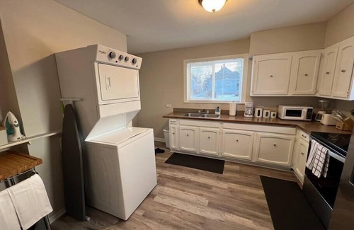 This beautiful home has all of the charm and quirks that come with 1900s design. The main level is equipped with an inviting living room that boasts a wall mounted 55" smart TV, a dining area, and a fully stocked kitchen complete with washer and dryer. Also on the main floor you will find our relaxing King Suite as well as a half bathroom. Did we mention quirks? One of this home's oddities is the cozy shower that you will find nestled in the corner of the king bedroom!