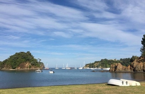 Sunny beachhouse, centre bay with an Island opposite. Flat section, large lawn area reaching down to the clear waters of a safe swimming beach. 20 mins North East of Whangarei and 2.5 hours from Auckland. Relax on the deck while you watch the water action. Open plan kitchen and lounge with the usual facilities. Dairy and restaurants are 5 mins down the road or just a short boat row away. A row boat, two kayaks and life jackets provided. Surf beaches 10 mins away. Spectacular views of the harbour and surrounding anchorage of the Tutukaka inlet. Fenced from the road. Plenty of room for trailers and boats to park and the lawn never gets muddy. Space for an extra tent or two with waterfront views. Soak it up!