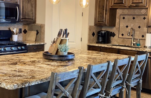 Our home boast three large bedrooms; The master which has a king size bed, 50" tv, door to the hot tub/yard, huge luxurious master bath with double sinks, separate jetted tub and walk in shower along with an oversized walk in closet. The second bedroom offers a queen bed with access to backyard patio, 42" tv, walk in closet and on suite with walk in shower. The third bedroom has two full size beds, closet and a tub/shower combo bathroom just outside the room. All bedroom lamps are equipped with USB plug ins. The kitchen is fully stocked with everything you may need during your stay. Our dining room table seats six people with four bar stools at the island or there is table/chairs outside as well. We also have a propane BBQ and a Traeger for all your grilling needs. We have WiFi and Direct TV throughout the home. During the cooler months we have a propane fireplace to enjoy! Our laundry room has front loader Samsung washer and dryer if needed during your stay. There is no access to garage but driveway is plenty suitable for truck/boat parking. We have the perfect pool to wade and enjoy a drink, no heating needed in the summer and hot tub for the cooler months, pool towels supplied!