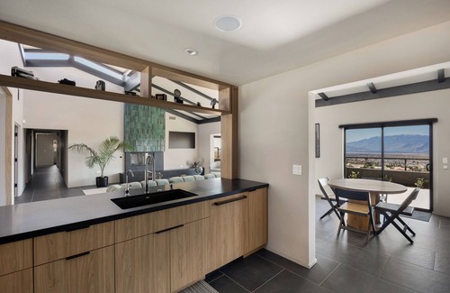 Wake up to the soft glow of desert light pouring through panoramic windows. Brew a morning coffee in the gourmet-grade kitchen, then step outside to the quiet courtyard pool, framed by cactus silhouettes. Spend the afternoon splashing in the 65-ft entertainer's pool or lounging under shaded patios with music playing from the built-in sound system. Gather around the custom dining table for a chef-prepared hibachi experience or fire up the grill for a sunset dinner with ridge-line views. As night falls, soak in the 14-person spa or roast s'mores by the fire pit under a sky ablaze with stars. From quiet reading nooks inside to bocce and yard games outside, Addendum Estate is designed to elevate every moment.