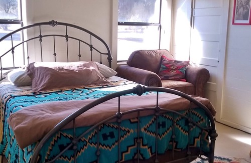 Located at the front of our 40 private acres, it sits conveniently in front of 1 of our 2 fishing ponds. Located next to the Adobe Cafe, this quiet retreat has pretty much the best of all worlds! Fully stocked kitchen, dining area and living room, as well as the internet/cable TV comforts of Home!