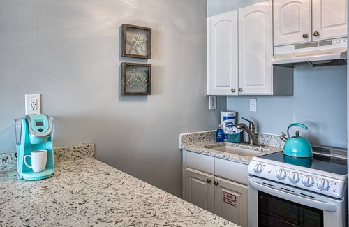 Overlooking the breathtaking view of the Gulf of Mexico, you'll find fresh updates including new shiplapped walls, fresh paint, fresh linens, and updated décor. It sleeps 4, features two queen beds with new Casper hybrid mattresses, a full kitchen, full bathroom, Keurig coffee maker, smart TV, USB ports throughout for work or study, walk-in closet for hanging/storage, luggage racks, and iron/ironing board. Soak up the views from a floor to ceiling bay window and enjoy the sight of the surf right from your bed. This condo is the ideal, affordable getaway for friends, couples, and small families. If your desired dates aren't available, please check our other two Salty Turtles® Beachfront listings. Read our guest reviews, book today, and you won't be disappointed!