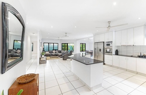 A bright, open plan layout is designed for the tropics, with louvre windows and tiled floors throughout. A comfortable living area provides the ideal space to kick back and unwind with a movie, with oversized lounges providing ample seating. Sliding glass doors open out to a spacious patio area complete with sandstone paving, where you can enjoy pool days while having a BBQ by the alfresco dining setting.