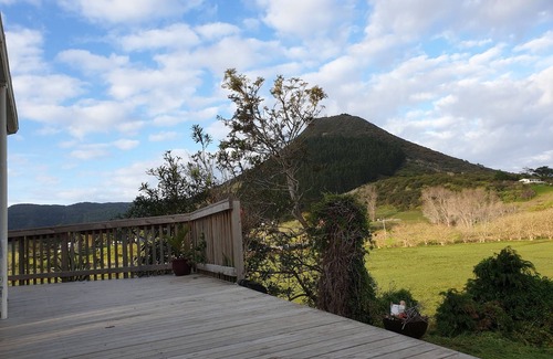 Cute house with large flat section with 1 bedroom (queen bed) and a separate cabin (double bottom, single top bunk bed). Huge wrap around deck with tables and chairs, hammocks. Farmland, forestry and glimpse of the ocean views from the deck. Kids tree hut, sandpit and swings.