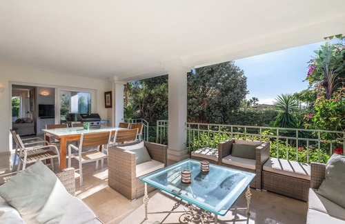 The villa’s highlight is its enchanting terrace, perfect for outdoor living. Complete with a comfortable seating area, dining space, and BBQ, it’s ideal for alfresco meals and entertaining. The terrace leads to a lush, mature garden that surrounds a sparkling pool, creating a serene and private setting for relaxation and fun. The property also offers secure parking for two cars.