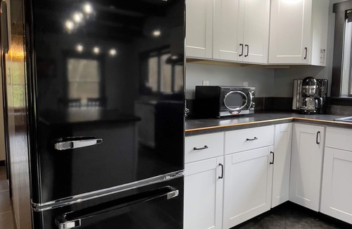 Fun fully-renovated retro diner inspired space! Light and bright! You can even enjoy doing the dishes with the big window looking out to the woods and nature, Fully stocked with major and minor appliances, dishes, cookware. Traditional drip coffee maker and grounds are available. Seating for 6 in the breakfast area with bright window views, plus additional seating for 8 in the adjacent enclosed all-season porch.