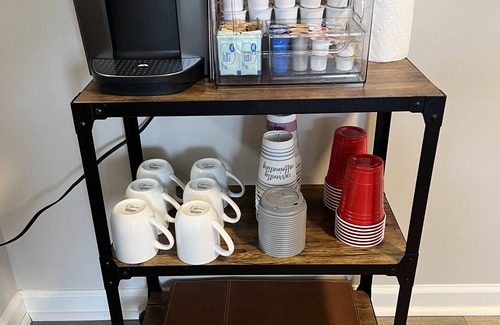 2 bedroom(queen bed in each)/2 ensuite bathroom(towels/linens provided), queen sofa bed (2" memory foam mattress topper available), full kitchen w/eat at bar, 2-4 person bistro table for dinning, coffee bar w/Keurig, toaster oven/air fryer combo, dishes, flatware, drinkware, full size washer/dryer, free Wi-Fi, smart TV (basic cable & ready for streaming), iron/ironing board, handheld clothes steamer, hair dryer(1/bathroom), starter supply of toilet paper, paper towels, laundry supplies and dishwasher detergent, shampoo/conditioner/body wash provided. NOTE: This is a second floor unit & requires you to walk up a flight of stairs to access, keep this in mind for guests with limited mobility. Also, given its a second floor unit and there are tenets above. There is a Ring camera on the front door for the safety of our guests.
