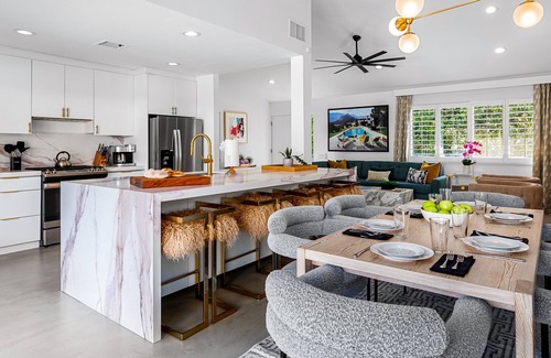 Welcome to Alluring Palms, your private Palm Springs pool retreat where mid-century modern design meets playful sophistication. This vibrant home blends cheerful retro-inspired interiors with luxurious comfort, creating a true indoor-outdoor paradise made for relaxing under the desert sun. Perfect for families, couples, or friends traveling together, Alluring Palms features stylish living spaces, resort-style amenities, a chef's kitchen, and breathtaking mountain views. Beds: K, K, Q