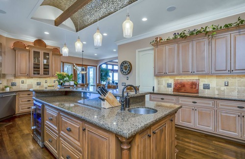 The kitchen and breakfast nook complete the great room. This kitchen is truly gourmet and will accommodate any hobby chef or professional. Granite counters throughout, large working island, multiple dishes, cookware, cutlery, baking and serving dishes, and utensils are provided. Whether you are preparing a quick snack or feast, most anything you need will be found here, all the while connecting with your friends and family, and able to keep an eye on activities in the backyard area.