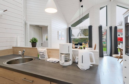The modern wooden house Seezauber impresses with its Scandinavian style and offers enough space for 5 adults and 3 children. Thanks to the ridge-high open ceiling, you can enjoy a pleasant feeling of space and light-flooded rooms. The maritime furnishings in light colours contribute to the cosy atmosphere.