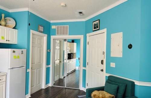 Very cute studio for 2 people. We have comfortable queen bed, pull out futon chair bed. white kitchen is combined with the room. We have washer and dryer, table, private porch where you can relax. Tanger Outlets and Walmart just 4-5 minutes to drive. Many restaurants within 5 minutes to drive. Private beach 5-8 minutes within walking distance . The amazing pool is on the other side of the house. New painting in the room and toilet, new refrigerator bigger size. We allow 2 small dogs or 2 cats.