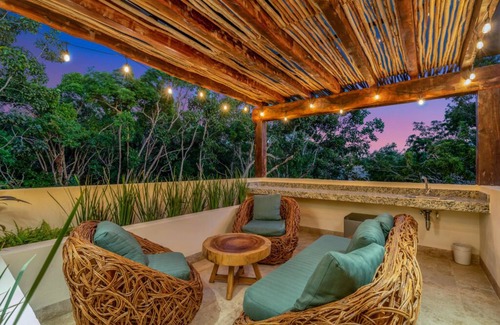 Private yard with pool in fully walled back yard. Take in beautiful sounds and sites of the jungle from the 3rd floor patio. Walk a block to the amazing nature park with one-of-a-kind architectural structures and 7 story tower with views of the Mayan ruins and the ocean.