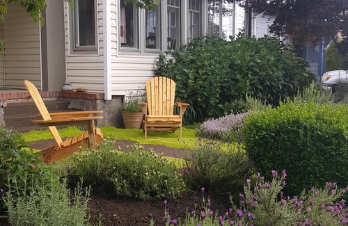 Our home consists of 1350 sf - (2) Bedrooms that are currently available – King Bed in downstairs bedroom and Queen Bed in upper bedroom, (1) Bathroom, Living Room with Flat Screen TV, Den (Cognac Room), Kitchen, Formal Dining Room, Kitchen Eating Nook, and Laundry (W/D). We also have a wonderful fenced, peaceful and private backyard area with numerous places to gather, eat, and relax around the inspiring landscape, herb & vegetable garden (help yourself) & Pinot Gris grape vines. Complete with a propane BBQ, outdoor Food Prep area, plenty of Seating options (large Picnic table/benches, Adirondack chairs), overhead Accent Lighting and accessible Covered area. The awesome “light filled” Formal Dining room is stunning, as is the rest of the house with an open and bright feeling throughout.