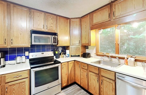 Take in the beautiful mountain and wooded views while enjoying a myriad of modern comforts. Treat yourself to a bubbling soak in our private hot tub, cozy up by the fireplace in cool evenings, or prepare a feast in the full-fledged kitchen!